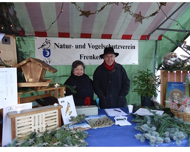 Der Natur- und Vogelschutzverein war am Samstag 8. Dezember 2012 mit einem Stand am Weihnachtsmarkt Frenkendorf präsent. Mit einer Auswahl an Nistkästen, Futterhäuschen und selbst hergestellten "Meisen-Zapfen" konnten wir auf unsere Arbeit aufmerksam machen und gleichzeitig unsere Vereinskasse etwas 'füttern'.